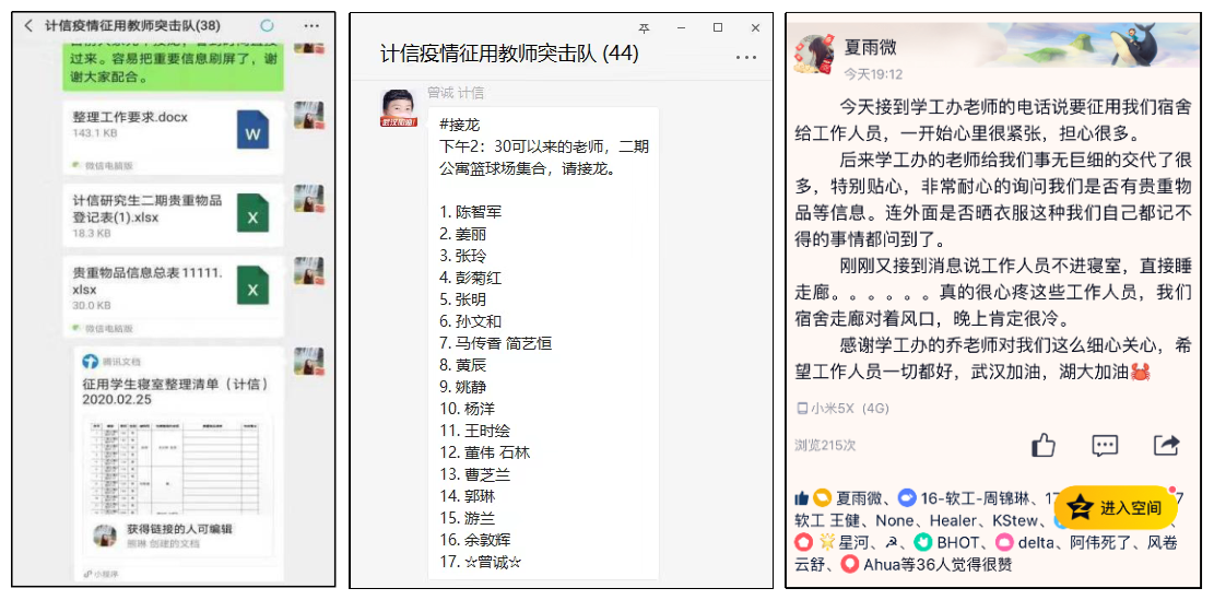 在疫情防控的攻坚阶段,我校二期宿舍被征用作为新冠肺炎治愈患者出院后的集中隔离点,我院积极响应,快速反应,第一时间成立了以院党委书记潘永才、院长王时绘为组长的工作组,连夜制定方案。一方面,学院迅速发动辅导员、班主任、学生骨干、班委,逐一电话、QQ联系住在二期的同学,告知征用事宜,做好解释工作,登记学生的贵重物品,奋战通宵,确保学生贵重物品损失降到最低;另一方面,连夜联系学院在汉教师党员、住在学校附近的教师,组建了34人的“教工突击队”开展工作,在汉的全体院领导,系部主任、教工党支部书记主动带头,一线参与战斗。
