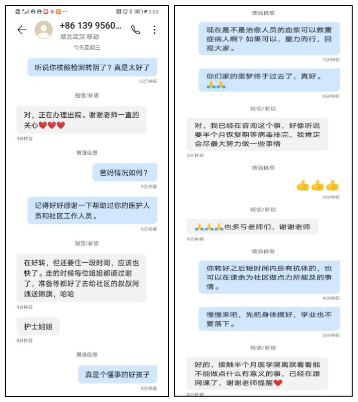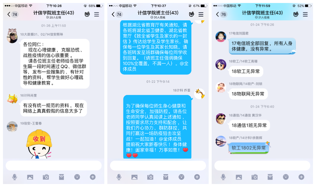 学院认真落实“日报告”和“零报告”制度,组织学院辅导员、班主任老师、班长、生活委员、网格员每天动态摸清每一名学生的动向及健康状况,密切关注跟进确诊、疑似、亲友病例等特殊学生群体的情况,及时上报学校,并对学生尽可能提供帮助并加以引导,坚定学生战胜疫情的信心。