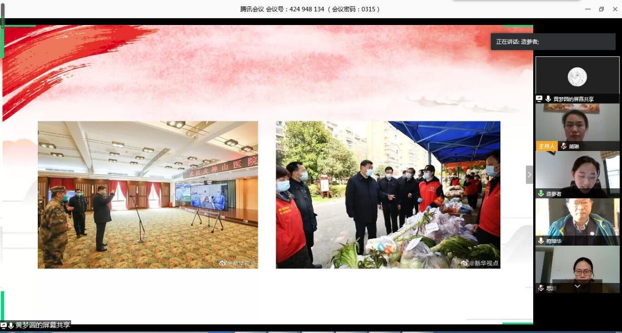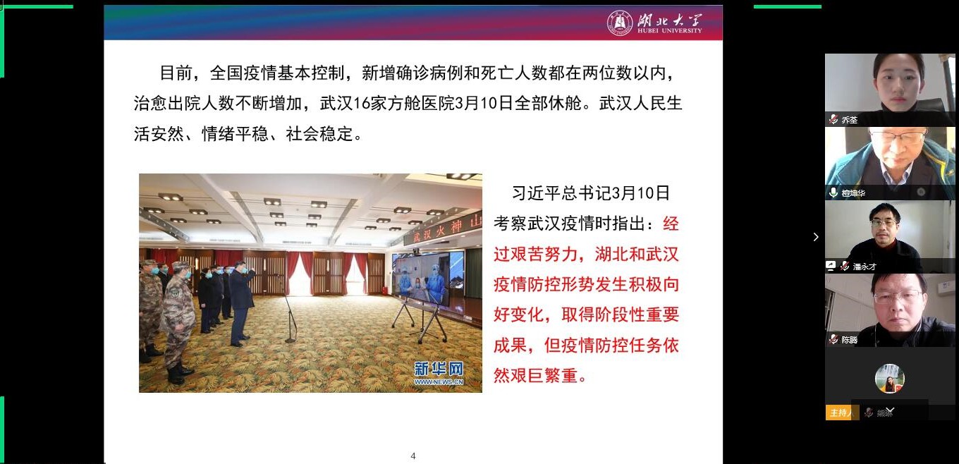 在第一环节疫情快讯中,班主任乔荃简要介绍了当前疫情现状,回顾了抗“疫”过程中的感人瞬间,带领大家学习领悟习近平总书记在武汉考察期间的讲话精神。