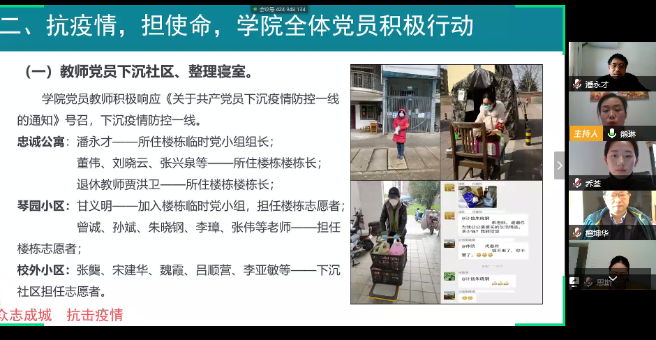 在第二个环节战“疫”情况中,熊琳以“主动作为战疫情 多措并举育桃李”为题,为同学们介绍了学院师生的战“疫”情况。她从“强责任、抓落实,学院领导班子主动作为”、“强责任、抓落实,学院领导班子主动作为”、“强责任、抓落实,学院领导班子主动作为”三个方面出发,图文并茂、详细地介绍了学院采取的各项举措。最后,她希望同学们能够把本职工作做好,只有教师教好课,学生学好学业,每个人都各司其职,众志成城,抗击疫情,胜利终将属于我们。