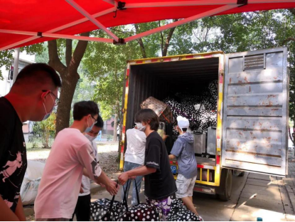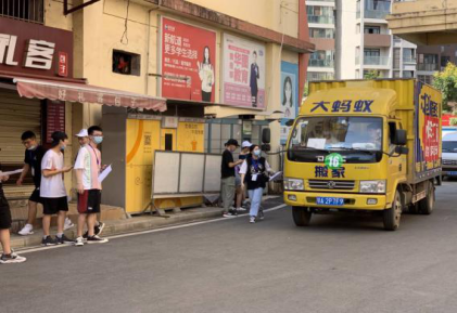 下午四时,第一辆装载学院学生行李的货车到达三期,引流小组的成员带领货车司机停到指定区域卸货,同时在行李上贴上标签纸,方便同学们寻找寝室对应楼栋的行李。随后,货车、客车陆续到达指定宿舍楼下。