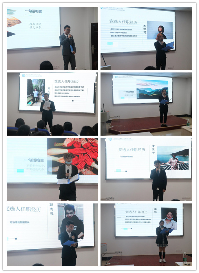 10月5日晚6时,学院2020年学生组织主席团换届大会在计信大楼102会议室顺利召开。院党委副书记熊琳,学工办老师,主席团成员以及竞选人员出席本次大会。