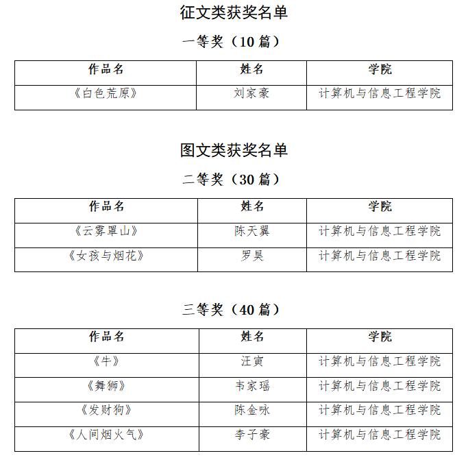 经初评、复评和学校审定,学院荣获优秀组织单位。我院学生计算机科学与技术1901班刘家豪的《白色荒原》获征文类一等奖,信息安全1901班陈天翼的《云雾罩山》和信息安全1901罗昊的《女孩与烟花》获图文类二等奖,王寅的《牛》、软件工程1902班韦家瑶的《舞狮》、软件工程1902班陈金咏的《发财狗》和软件工程1901班李子豪的《人间烟火气》获图文类三等奖。