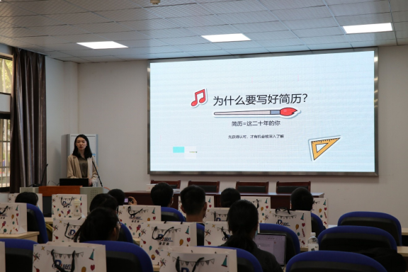 在互动环节中,同学们踊跃提问,老师也进行了积极解答,形成了良好的互动氛围。会议后半段,黄莎老师介绍了简历制作的四大原则与标准,从面试官的角度对多份简历进行举例分析,并对现场收到的简历进行针对性点评,帮助同学们扬长避短,展现自身优势。
