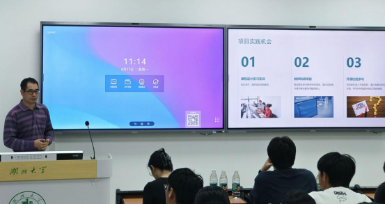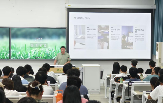 肖奎、孙斌分别向新生全面介绍了学院基本情况、学科特色、专业设置、人才培养特色及学习发展建议等,引导学生强化专业认识、了解专业特点。肖奎着重讲解了学院专业办学特色和基础课程体系,帮助同学们深入了解所学专业及发展前景。孙斌则着重强调了理论与实践相结合的重要性,他鼓励同学们不仅要掌握高效的学习策略,还要积极寻找项目实践的机会,以此提升自身的专业技能与实践能力。