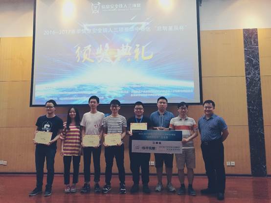 “HuBu”团队由14级信息安全专业尹普、吴建良、刘若晨、刘紫琴,15级信息安全专业肖海涛、徐宽,共6名同学组成。在4月8日的“信息安全铁人三项赛”之线上资格赛上,我院团队表现优异,成功取得晋级赛资格。在6月的晋级赛中,团队同华中地区的武汉大学、华中科技大学、郑州大学等12所高校同台竞技,凭借各成员稳定的发挥和扎实的知识功底,最终取得企业赛三等奖,数据赛、个人赛优秀奖的好成绩。