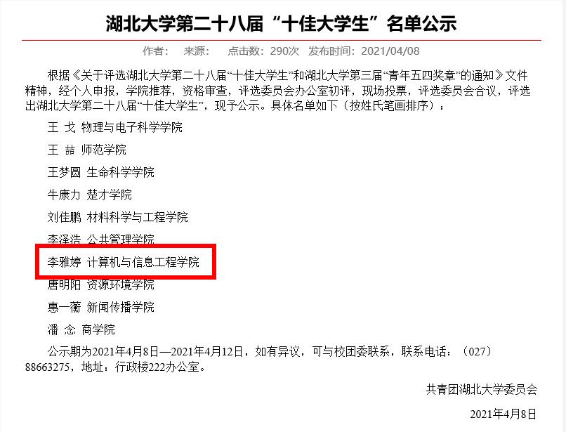 4月7日下午,第二十八届ok138cn太阳集团“十佳大学生”评选展示大会在思睿厅举行。全校共有20位不同学院的候选人参与现场PPT答辩,彰显了优秀湖大学子求实创新的精神风貌。经过个人申报、学院推荐、资格审查、与评选委员会评定等环节,我院2017级计算机科学与技术专业李雅婷脱颖而出,成功当选“十佳大学生”。