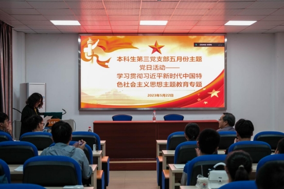 为进一步发挥学院领导班子在学习贯彻习近平新时代中国特色社会主义思想中的“头雁”作用,根据学院主题教育读书班方案要求,学院党委委员走进联系党支部开展“委员督学”,推进主题教育走深走实。5月22日晚,学院党委书记秦明君参加本科生第三党支部5月主题党日活动,在支部开展主题教育专题学习环节,为党支部师生讲授题为“以德为先,做有理想、有担当、能吃苦、肯奋斗的新时代好青年”的专题党课,支部书记彭菊红主持活动。