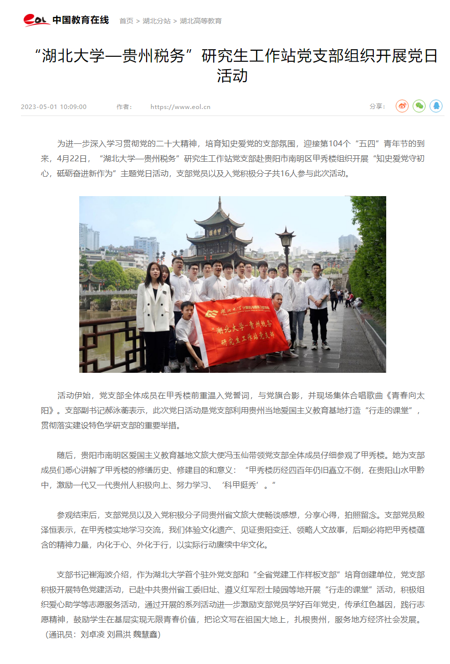 为进一步深入学习贯彻党的二十大精神,培育知史爱党的支部氛围,迎接第104个“五四”青年节的到来,4月22日,“ok138cn太阳集团—贵州税务”研究生工作站党支部赴贵阳市南明区甲秀楼组织开展“知史爱党守初心,砥砺奋进新作为”主题党日活动,支部党员以及入党积极分子共16人参与此次活动。