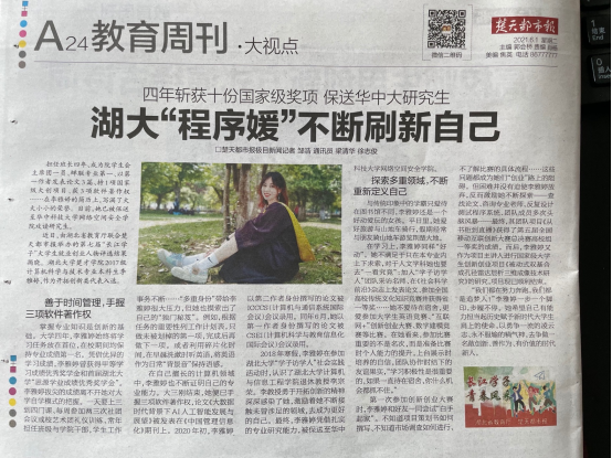在学习上,李雅婷同样“好动”。她不满足于只在本专业内上下求索,对于人文学科她也要去“一看究竟”:加入“学子访学人”团队采访名师、在《社会科学前沿》杂志上发表论文、参加全国高校传统文化知识竞赛并获得省一等奖……她不爱待在宿舍,更爱参加大学生英语竞赛、“互联网+”创新创业大赛、数学建模竞赛等比赛。在她看来,参加比赛重要的不是名次,而是准备比赛时个人能力的提升,上台展示时培养的自信,团队协作时结下的友谊果实,“学习积极性是很重要的,如果一直待在宿舍,你什么机会都抓不住。”