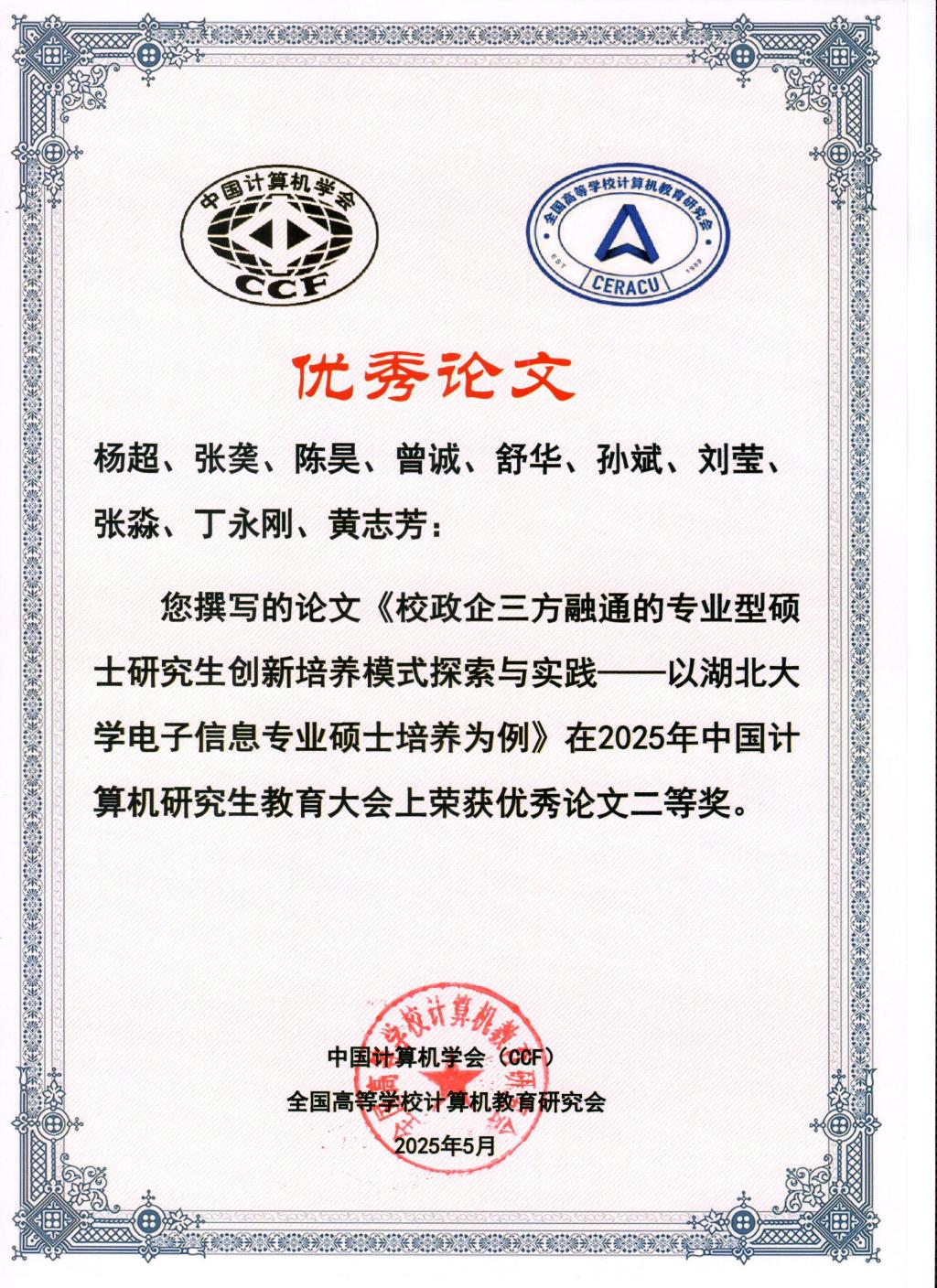 大会设有计算机专业研究生教育相关的教育教学研究论文征集和评优环节,我院投稿的教研论文《校政企三方融通的专业型硕士研究生创新培养模式探索与实践——以ok138cn太阳集团电子信息专业硕士培养为例》被大会录用并获评二等奖。